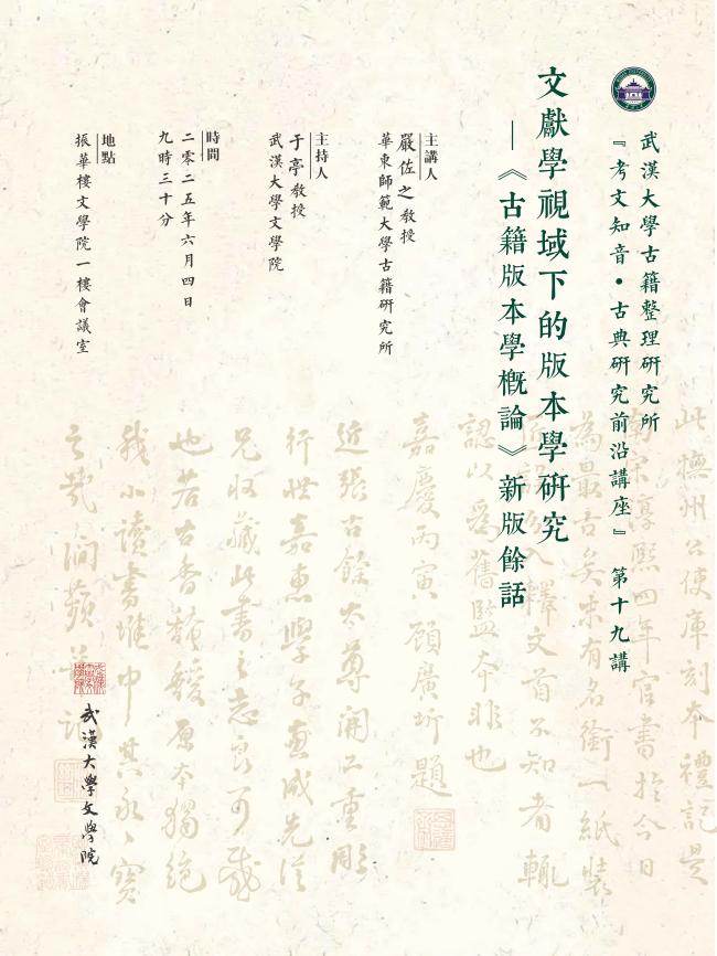 2025年6月4日上午,成人直播网站 古籍整理研究所“考文知音·古典研究前沿讲座”的第十九讲在成人直播网站 一楼会议室成功举行。华东师范大学古籍整理研究所严佐之教授受邀来成人直播网站 做了题为“文献学视域下的版本学研究——《古籍版本学概论》新版余话”的精彩讲座。本次讲座由成人直播网站 于亭教授主持。成人直播网站 校内外数十名师生到场学习。