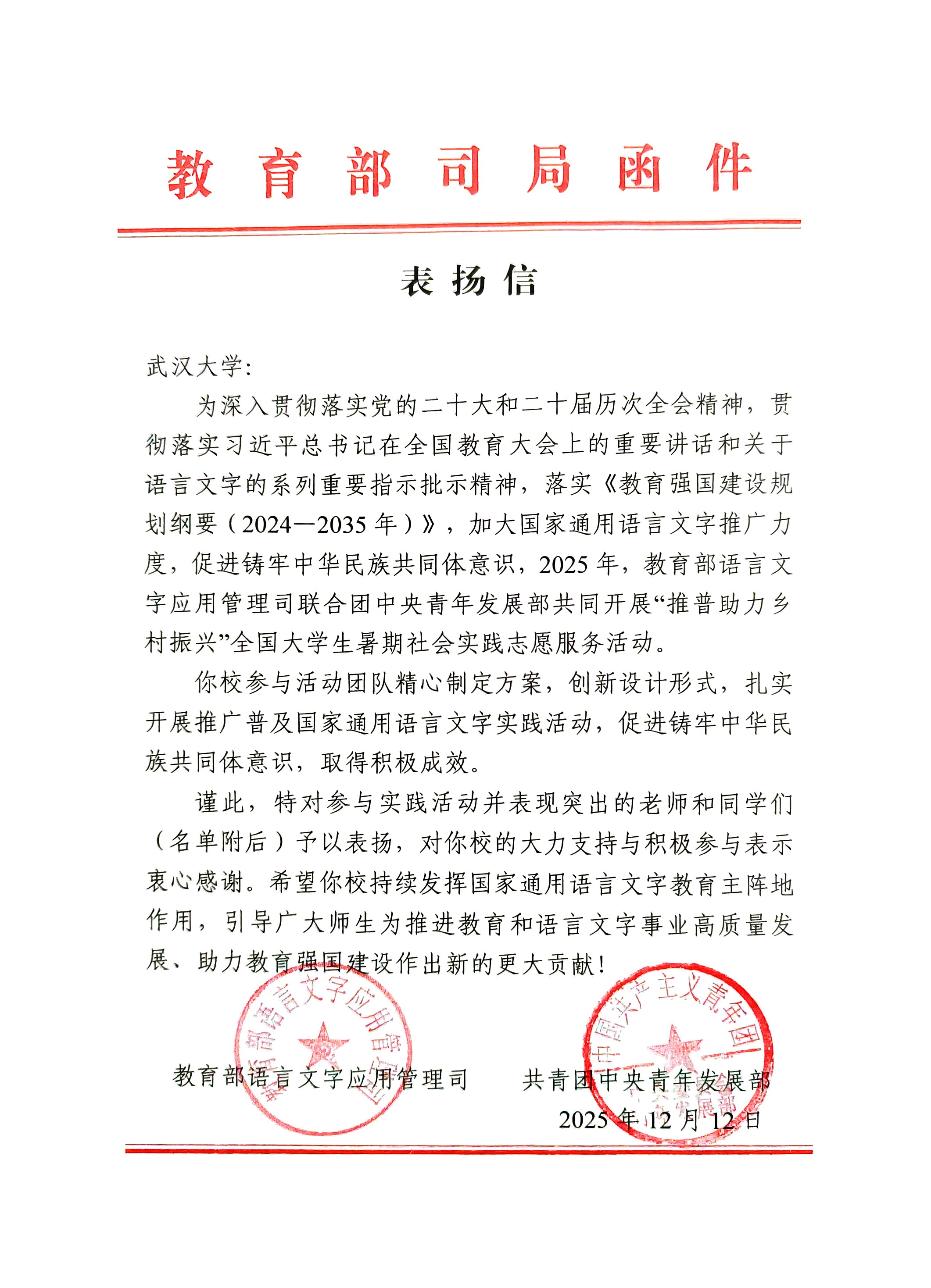 (通讯员:孙小媛 张乐 柳金贝)12月22日,学校收到教育部语用司、团中央青年发展部来函,对我校在2025年“推普助力乡村振兴”社会实践志愿服务活动中高度重视、精心组织给予肯定,对参与实践活动并表现突出的师生予以表扬。其中,成人直播网站 “石榴籽·语相通”学生社会实践队获评优秀团队,指导教师葛刚岩、王若飞以及来自成人直播网站 、弘毅学堂、数学与统计学院、测绘学院、计算机学院的13位同学受到表扬。