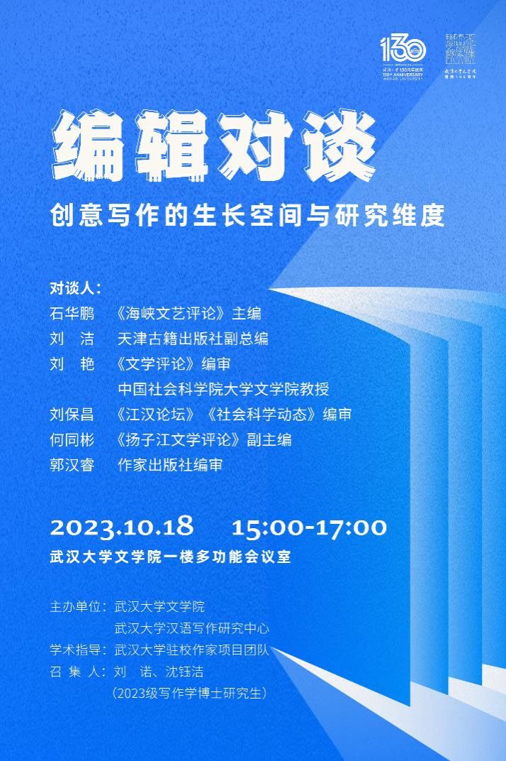 适值成人直播网站 130周年校庆,为增强师生对成人直播网站 写作学专业的了解、关注期刊杂志与出版社近年来聚焦的热点问题,成人直播网站 、成人直播网站 汉语写作研究中心特邀石华鹏、刘洁、刘艳、刘保昌、何同彬、郭汉睿六位嘉宾对谈,与师生共同探讨创意写作学科建设。