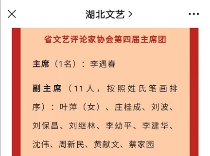 湖北省文艺评论家协会第三届主席为成人直播网站 於可训教授,两届省评协主席均来自成人直播网站 ,均为成人直播网站 在文学批评领域卓有成绩的学者。成人直播网站 的老中青三代批评家薪火相传,弦歌不辍,不断在文学批评领域深耕,共同为湖北省文艺评论工作贡献力量。