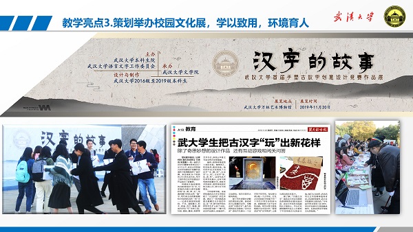 3)课程教学特色鲜明,教学活动影响广泛。新华网、人民网、光明网、中国教育网络电视台、湖北日报、楚天都市报、楚天金报、武汉教育电视台、成人直播网站 新闻网、成人直播网站 官方微信、成人直播网站 英文网站都曾报道过“古代汉语”、“书法艺术与汉字变迁”的创意教学活动,引来了国内其他高校的交流学习。近四年,王统尚应邀向全国其他高校的教师做了9场教学改革经验分享会。王统尚老师还被湖北电视台教育频道和湖北卫视邀请,担任《汉字解密》和《奇妙的汉字》节目嘉宾和评委,把专业知识服务社会精神文明建设,扩大了我校的影响力。