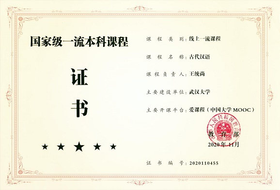 2)开展混合式教学探索,成绩斐然。建设在线开放课程“古代汉语”慕课,使学生在教师的引导下自主学习、激活潜力,学生学习达到了良好的预期效果。截至2022年4月,所建慕课已在各类平台点播超50万人次。课程本身先后获中国最美慕课二等奖、全国高校混合式教学设计创新大赛一等奖、湖北高校首批省级本科精品在线开放课程、2019年成人直播网站 教学成果奖一等奖等荣誉,并于2020年被教育部认定为首批国家级一流本科课程,2021年被“学习强国”收录,2022年被“国家高等教育智慧教育平台”收录,成为在全国颇有影响的专业课程。