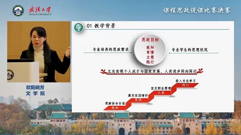 欧阳晓芳老师说课的节段是“汉语国际教育概论”第一讲第二节“发展汉语国际教育的意义”。欧阳老师的教学设计十分用心和独到,她立足专业特色、课程特点和学情分析来确定思政需求,结合教学大纲进行教学内容的整合与完善,提炼思政元素、精选思政素材,根据重点突出、难点分散的原则安排教学顺序、设置教学环节,构成完整的教学过程,同时根据学情和思政素材来进行具体的教法学法设计,设计中注重线上拓展和课外延伸,完成教学之后根据学生的课堂表现、课后反馈乃至后续表现来检测教学效果,师生共同总结反思,为下一轮课程开展提供参考。