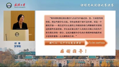 叶李老师说课的节段是中国现代文学史当中呐喊选讲:鲁迅的《狂人日记》,叶老师在专业教学上探索将文学教育、批评实践、文学生活三打通,又以这样的教学探索对接课程思政,同时,将“思政”中的思想塑造、价值引领融入专业教育,以情感人,以美“动”人、以文化人,以德育人。在教学理念上将思政与课程相融合、思想与知识相融合,在学生的生活世界里生根,形成学生对生活朴素的理解,内化到个体生命之中,指引学生追求积极的人生价值,内图个性之发展,外图贡献于其群。在教学过程中将文学知识、艺术分析与思想、文化价值相融合;通过讲授经典作家作品,启发学生与伟大的心灵对话,培养自我健全的人格和社会使命感并认同积极的文化追求;叶老师语言表达流畅、富有激情和感染力。