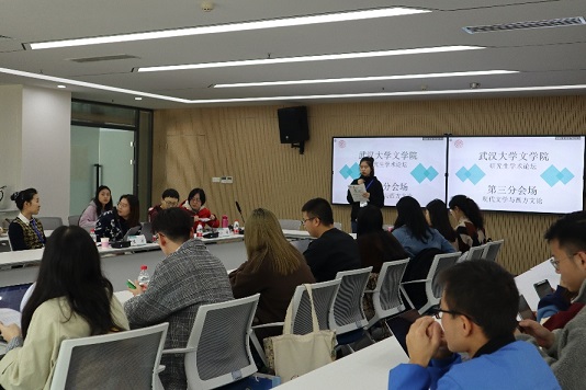 三场分论坛发言及研讨在下午同时举行。第一分会场“语言学与文献学”的发言人有语言学及应用语言学硕士生高孟悦等6名同学,郭婷婷老师、刘丹老师对每位同学的发言进行了点评。第二分会场“古代文学与古代文论”的发言人有中国古代文学硕士生武婷婷等8名同学,葛刚岩、汪超、钟志辉和袁劲四名老师分别对大家的发言进行了点评。第三分会场“现代文学与西方文论”的发言人有中国古代文学硕士生陈宫慧等10名同学,叶李、艾士薇、朴婕和陈溪四名老师对他们的发言依次点评。向金玲、蒋润、成之珍同学作为小组代表对分会场的发言讨论情况进行了报告。