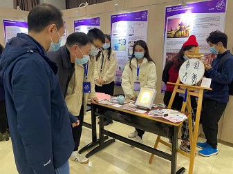 本科生院张绍东院长、王福副院长等校领导以及外语学院李圣杰副院长、艺术学院王文斌副院长等兄弟院系领导在成人直播网站 展台前仔细询问作品的创意和制作情况,称赞参展作品创意巧妙、制作精美、传达了丰富的文化意蕴。