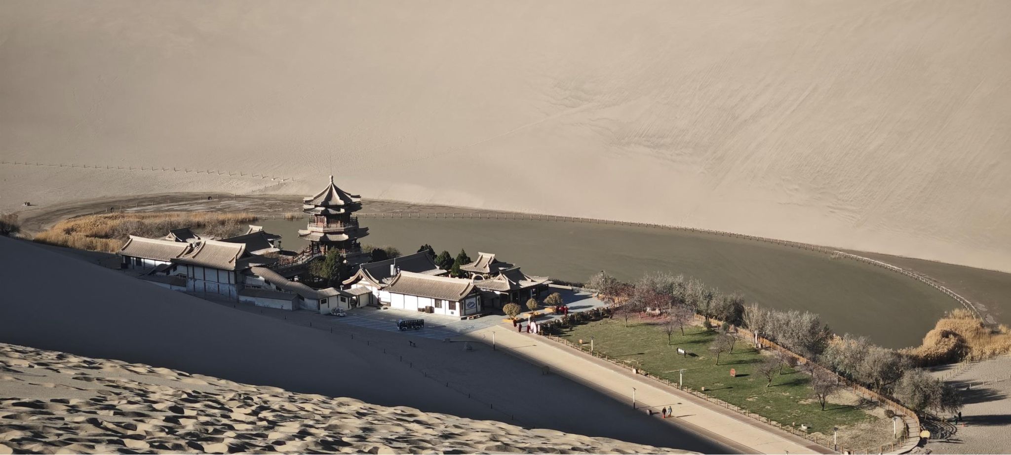 与月牙泉相依的鸣沙山,被誉为世界上最美丽的沙漠之一,也是这次游学同学们最令人向往的自然景点之一。这座壮美的沙丘,承载着悠久的历史和丰富的文化遗产,吸引着无数游客前来探寻其神秘之处。当你踏入这片沙漠时,眼前的景象会让你心生敬畏。沙丘起伏不定,有些高耸入云,有些则低矮平缓,仿佛翻腾的金浪。微风吹过时,沙子发出悦耳的沙沙声,这也是鸣沙山得名的由来。
