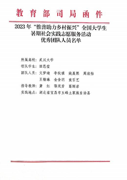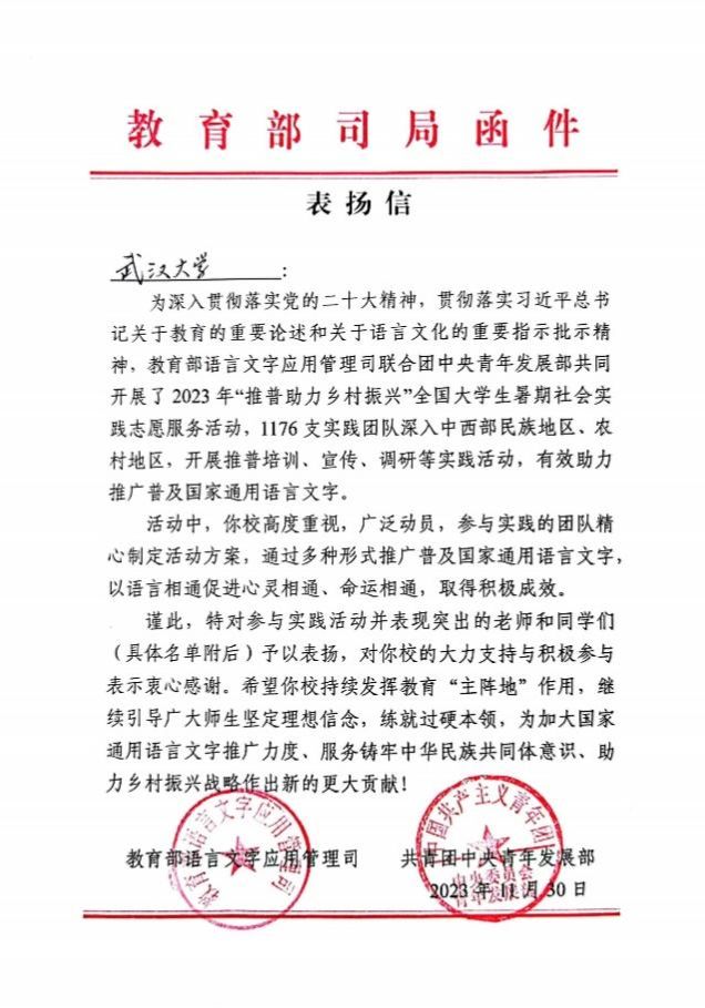 近日,2023年“推普助力乡村振兴”全国大学生暑期社会实践志愿服务活动评优结果公布,成人直播网站 “武大学子五峰推普行”社会实践团队荣获“优秀团队”称号。教育部语言文字应用管理司、共青团中央青年发展部专门给成人直播网站 发来表扬信,对成人直播网站 师生团队在服务国家通用语言文字推广、服务铸牢中华民族共同体意识、助力乡村振兴战略中作出的贡献给予充分肯定。