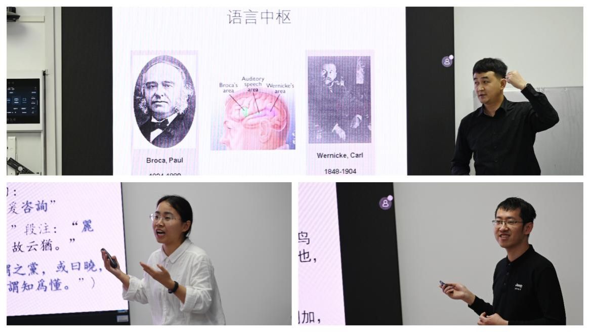 第三, 与时俱进,学以致用,展现了教学科研对现实的关切和回应。陈菡老师辨析了训诂学中方式与方法的区别,又讲授了黄侃提出的互训、义界和推因这三种主要训诂方式,讲解时多用现实情况类比,便于理解的同时也增强了古典知识的现实感。刘翔宇老师主要讲授现代汉语的例外读音问题,指出现代汉语中不符合从中古到现代演变规律的读音的各种研究材料来源,并分析了例外的成因。王宇波老师的讲授主题是失语症,他生动地讲解了语言障碍的分类、不同言语障碍症状表现以及针对性的语言康复的注意事项和训练方法等内容,最后还介绍了语言中心研发的用于判定和治疗语言障碍的系统。