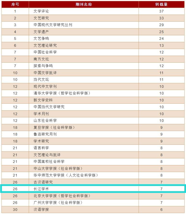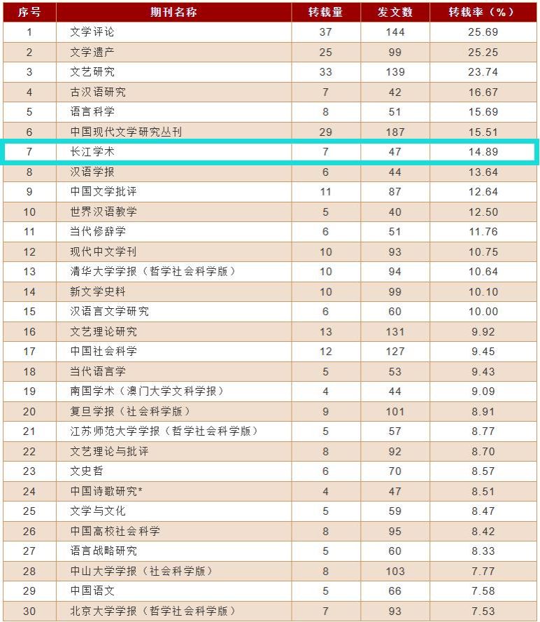 4月25日,《复印报刊资料重要转载来源期刊(2023年版)》正式发布,《长江学术》持续入选,在中国语言文学期刊中转载率排名第7,综合指数排名第10,全文转载量排名第26(详见附表)。