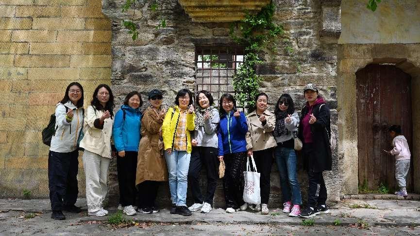 老师们三三两两探访小村古宅,该村现存50多户石砌屋,大部分至今仍保持较完好,这些石屋雕梁画栋,20余条巷子纵横分隔,是典型的明清徽派建筑风格,小村先祖曾有过"一门三太守,五代四尚书"的辉煌历史。几位老师在民间艺术博物馆以及各种雕花门楣前驻足,青年教师们则举着手机,将鎏金窗棂与紫藤花影叠印成九宫格里的诗行。