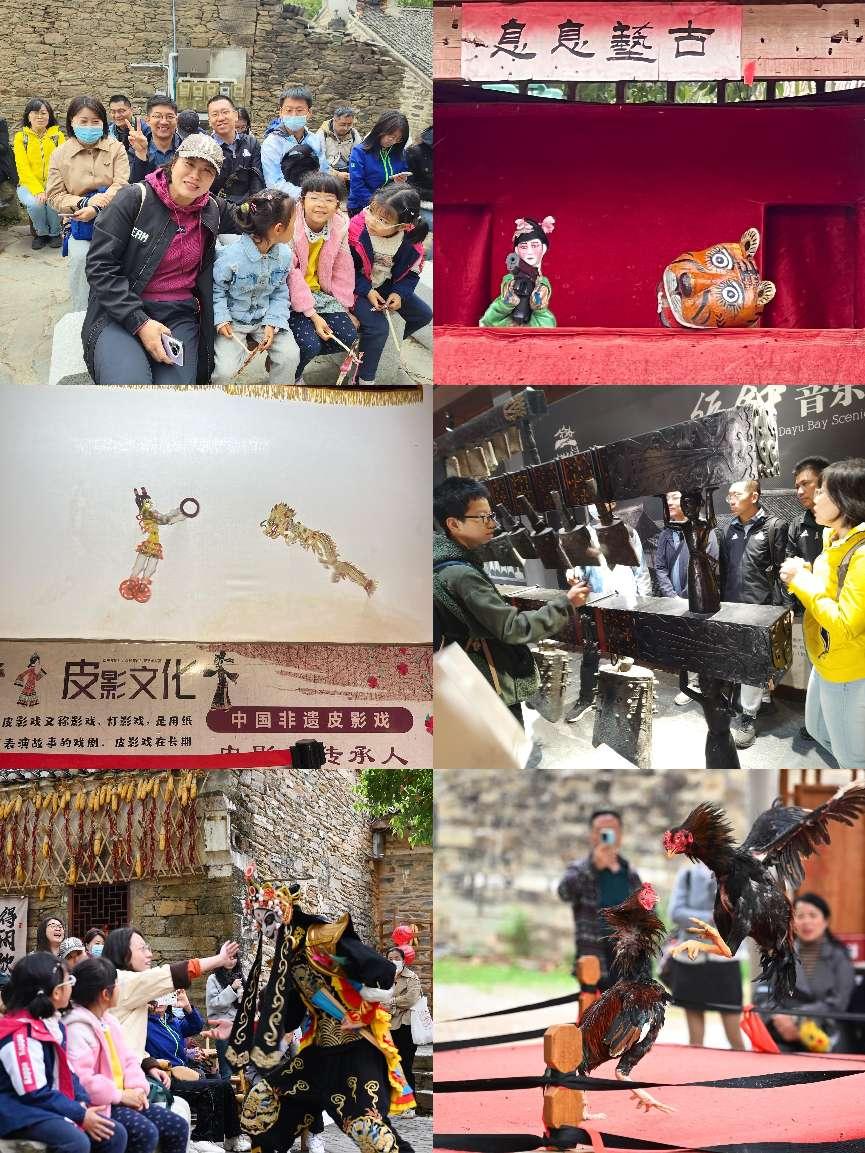 一路上,多场非遗展演在村口戏台、深宅大院内分别登场,引起游人纷纷驻足观赏。率先登场的川剧变脸,朱袖翻飞面具幻化间,赤面虬髯忽作粉面朱唇,引得满座惊呼。皮影戏《哪吒闹海》,牛皮人偶哪吒、龙王、虾兵蟹将在纱幕上腾挪跳跃,光影交错间仿佛重现了今年大火的魔童小哪吒的英雄气概。村中露天戏台上演的滑稽木偶剧吸引了大家,几个傀儡在丝线牵引下唱念做打,恍若真人生生被缩进了三尺戏台。斗鸡场上的羽翼翻飞与台下孩子们的笑声相和,古老娱乐形式在当代目光注视下焕发新生。